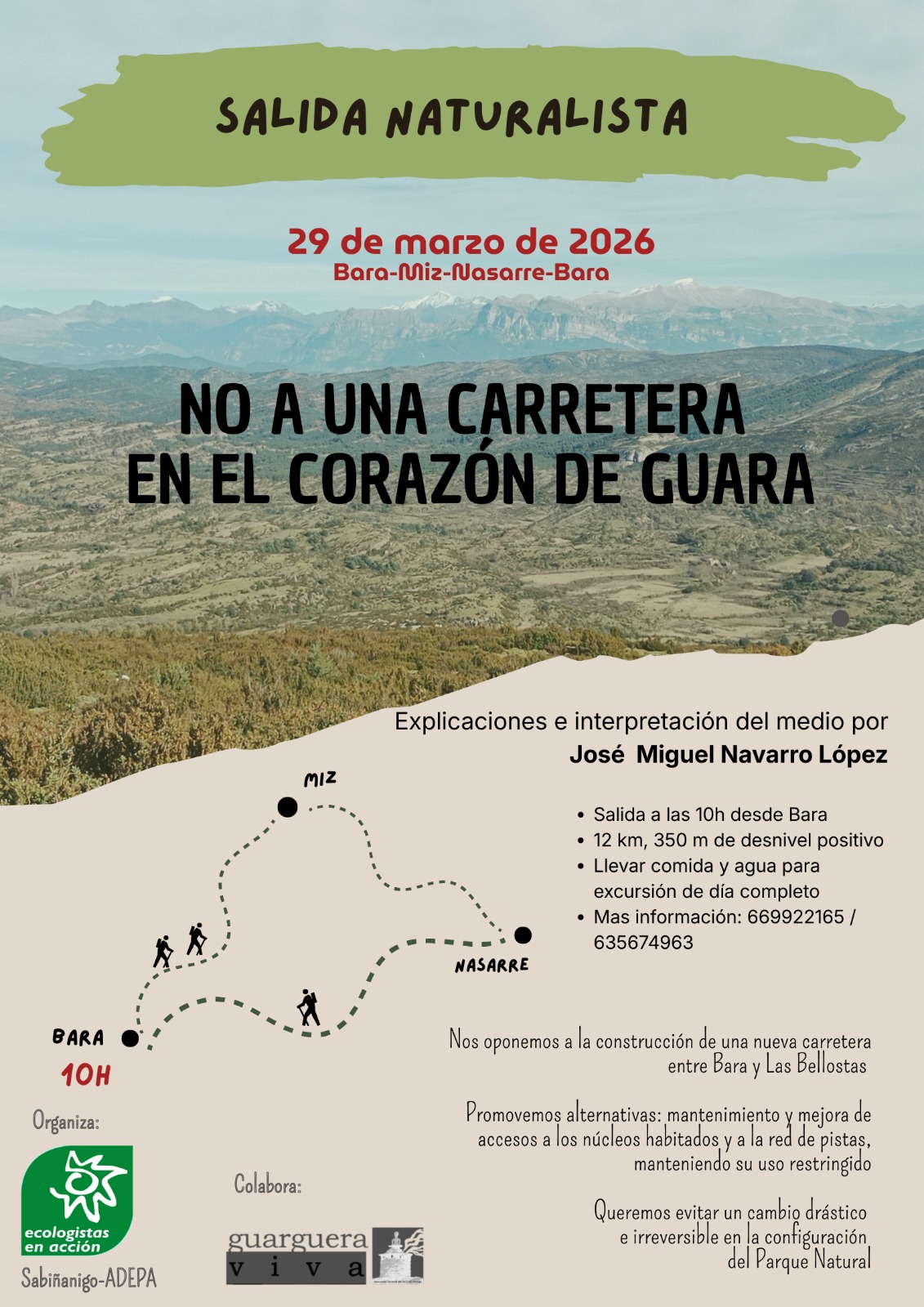 Cambiar Sabiñánigo ha mostrado su apoyo a la marcha naturalista y reivindicativa convocada para el próximo 29 de marzo bajo el lema “No a una carretera en el corazón de Guara”, al tiempo que reafirma su oposición a la construcción de la carretera entre Bara y Las Bellostas, en pleno Parque Natural de la Sierra y Cañones de Guara.