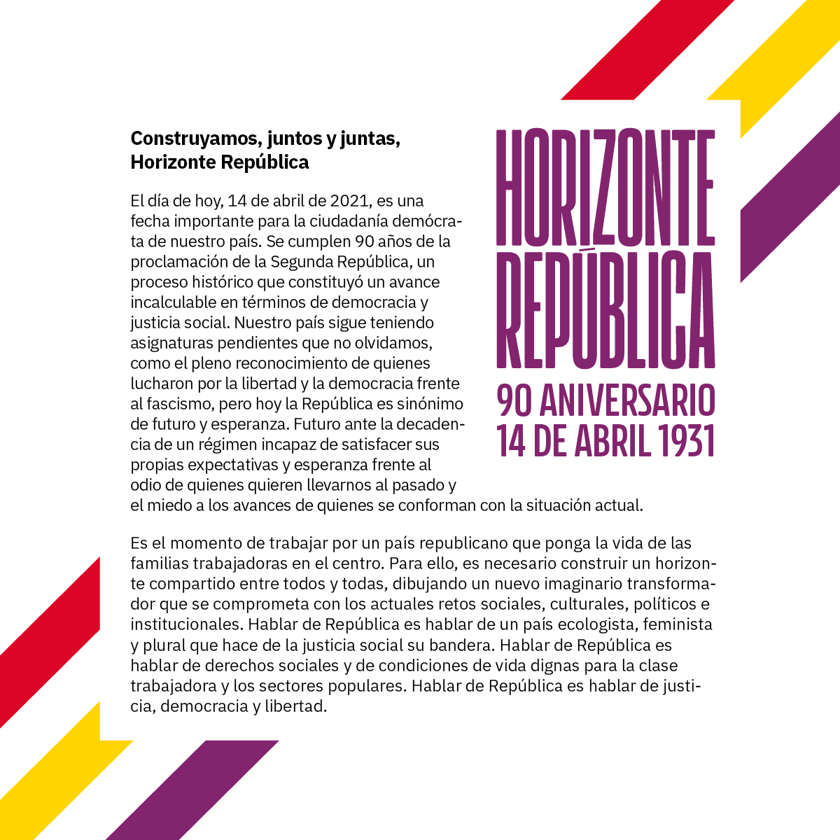 Aseguramos que defender hoy la República es más necesario que nunca por cuanto se han demostrado imprescindibles la solidaridad, cooperación, igualdad, justicia y participación que la caracteriza para afrontar la crisis. Sin olvidar que el modelo republicano es básico para construir una sociedad que cuide realmente a su población por encima de todo.