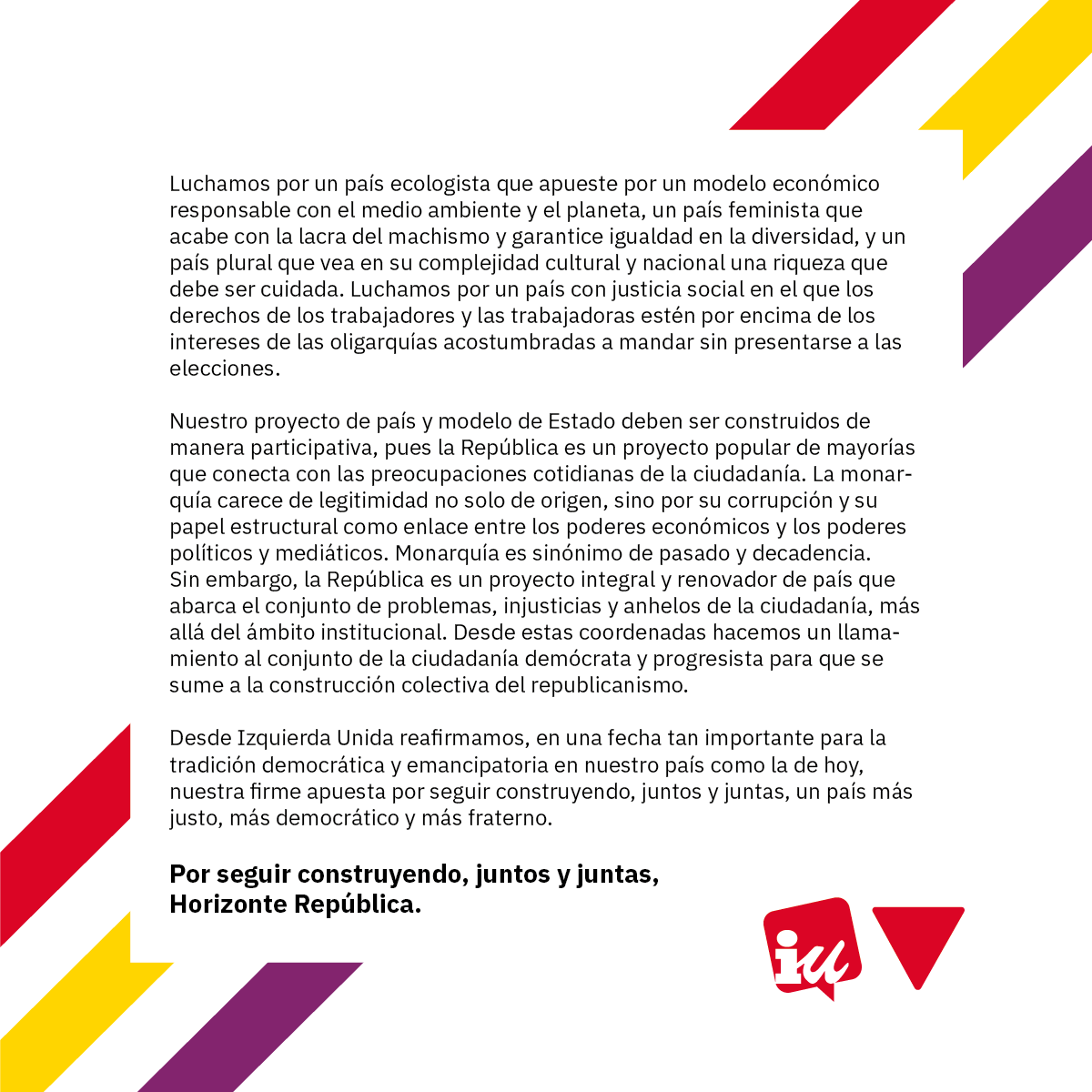 En IU defendemos que un Estado republicano es el único modelo que garantiza la redistribución de la riqueza, la igualdad o unos servicios públicos fortalecidos. “Hay que superar un modelo caduco incapaz de hacer frente a los retos que tenemos como sociedad”, afirma nuestro coordinador general.